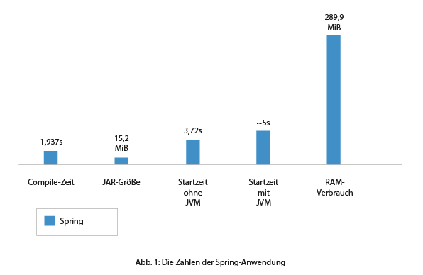Ressourcenverbrauch: Einige interessante Metriken der Anwendung sind in Abbildung 1 zu sehen. Als Compile-Zeit wird die Zeit für den Gradle-Task bootJar nach einem vorherigen ./gradlew clean genommen. Die Startzeit beträgt laut Spring-Ausgabe 3,72 Sekunden. Die tatsächliche Startzeit enthält zusätzlich noch die Startzeit der JVM, womit sie in Summe etwa 5 Sekunden beträgt.