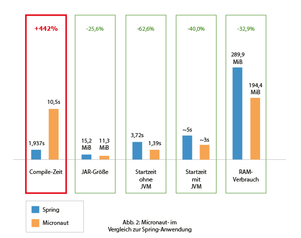 Ressourcenverbrauch: Die Zahlen der beiden Beispielanwendungen im Vergleich sind in Abbildung 2 zu sehen. Dies zeigt die Verbesserungen von Micronaut gegenüber Spring. Während die Compile-Zeit nun signifikant länger ist, kann das Framework bei anderen Metriken punkten. Dabei ist zu beachten, dass die Startzeit je nach Größe der Anwendung bei Spring immer länger werden wird, während die Startzeit der Micronaut-Anwendung relativ konstant bleibt.