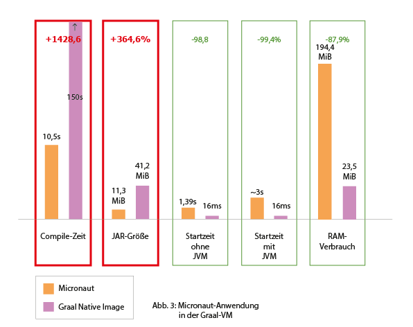 Die Compile-Zeit ist verständlicherweise miserabel. Nicht nur, dass Micronaut die Beans zur Compile-Zeit auflöst. Darüber hinaus wird der resultierende Java Bytecode in nativen Code übersetzt. Vorteil für Entwickler: Der Schritt muss lokal eigentlich nie ausgeführt werden. Während man lokal auch die Java-Version zum Testen nutzen kann, führt lediglich der Build-Server den zeitfressenden Kompilierungsschritt aus. Auch der Größenunterschied ist nicht wirklich problematisch. Die JAR an sich ist zwar nur 11,3 MiB groß, jedoch benötigt man hierfür noch eine JRE, die noch einmal Platz verbraucht. Die Binary kommt auch ohne eine JRE aus und kann einzeln oder innerhalb eines minimalen Docker Image ausgeliefert werden. Besonders der geringe RAM-Verbrauch zeigt, wie wertvoll der Ansatz für die Serverless-Welt sein kann, in der jedes Megabyte RAM bares Geld kostet.