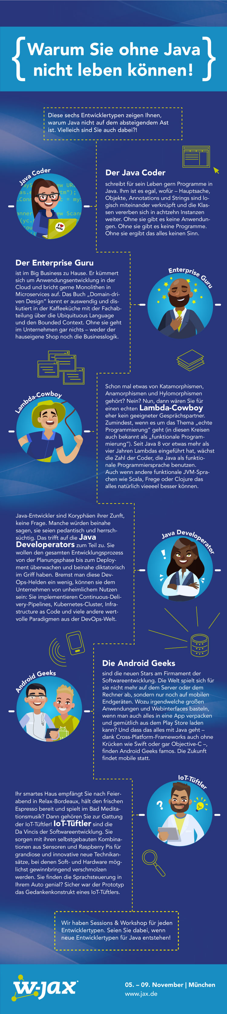 Falls Sie immer noch nicht überzeugt sein sollten, dass Java eine rosige Zukunft vor sich hat, wird unsere Infografik Ihren Standpunkt ändern. Wir betrachten die unterschiedlichen Typen die es in der Java-Enterprise-Welt gibt und zeigen, was die Frauen und Herren im Digitalen so treiben.